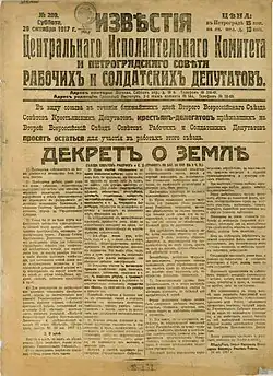 El Decreto sobre la Tierra fue aprobado por el II Congreso de Sóviets de Diputados Obreros, Soldados y Campesinos el 8 de noviembre de 1917 (26 de octubre en el calendario juliano), tras el éxito de la Revolución de Octubre.