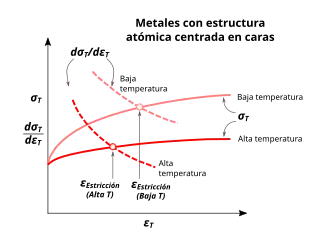 Esta figura también muestra la dependencia de la tensión de formación de estricciones a diferentes temperaturas. En el caso de los metales con estructura atómica centrada en caras, ambas curvas de tensión-deformación en su derivada dependen en gran medida de la temperatura. Por lo tanto, a temperaturas más altas, el estrechamiento comienza a aparecer incluso con un valor de deformación más bajo.