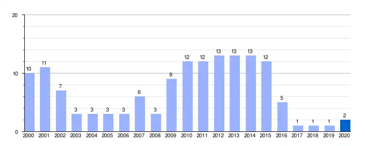 | Gráfica de evolución demográfica de Dehesilla entre 2000 y 2020 |