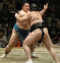 - ↑ a b Buckton, Mark (28 de julio de 2009). «Dejima bows out as Hakuho picks up another Emperor's Cup». The Japan Times. Consultado el 3 de octubre de 2012.