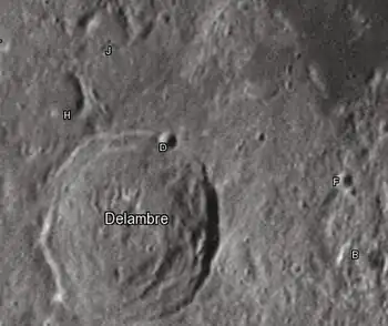 Delambre es un cráter de impacto lunar que se encuentra al suroeste del Mare Tranquillitatis, en la región central del altiplano. Al oeste se encuentra el par de cráteres Theon Junior y Theon Senior, estando este último más distante y situado al noroeste. Tiene 52 kilómetros de diámetro y 3,5 kilómetros de profundidad. Debe su nombre a Jean Baptiste Joseph Delambre, un astrónomo francés[1] del siglo XVIII.
