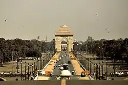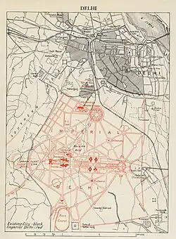 Lutyens dirigió a un grupo de arquitectos para diseñar la zona administrativa central de la ciudad, con la condición de mantener un tercio de la superficie como zonas verdes. En el corazón de la ciudad estaba la impresionante Rashtrapati Bhawan, antiguamente conocida como Casa del Virrey, situada en la cima de Raisina Hill. El Rajpath, también conocido como Camino del Rey, conecta la Puerta de la India con Rashtrapati Bhawan, mientras que Janpath, que la cruza en ángulo recto, conecta South End Road (renombrada Rajesh Pilot Marg) con Connaught Place. Actualmente, Rashtrapati Bhawan es la residencia oficial del presidente de la India.