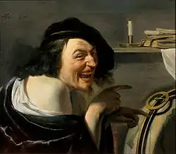 Demócrito también fue conocido como El filósofo risueño (en contraste con Heráclito, "el filósofo llorón") al ser propenso a reírse de la ignorancia del mundo y considerar la alegría como el objetivo de la vida.[17]