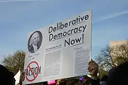 El término democracia deliberativa "designa un modelo normativo –un ideal regulativo– que busca coordinar la noción de democracia representativa al uso mediante la adopción de un procedimiento colectivo de toma de decisiones políticas que incluya la participación activa de todos los potencialmente afectados por tales decisiones, y que estaría basado en el principio de la deliberación, que implica la argumentación y discusión pública de las diversas propuestas".[1]