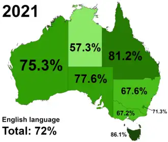 La inmensa mayoría de los australianos habla inglés en casa, salvo los aborígenes australianos y los inmigrantes de primera generación. Aunque Australia no tiene lengua oficial, el inglés siempre ha sido el idioma nacional de facto y la única lengua común.[25] El inglés australiano es una variedad principal del idioma, con un acento y un léxico distintivos,[26] y difiere ligeramente de otras variedades del inglés en gramática y ortografía. El australiano general (General Australian English) es la variedad estándar.