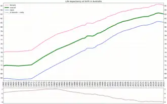 - ↑ Oficina Australiana de Estadística. «3302.0.55.001 – Life Tables, States, Territories and Australia, 2015–2017» (en inglés). Consultado el 21 de abril de 2019.