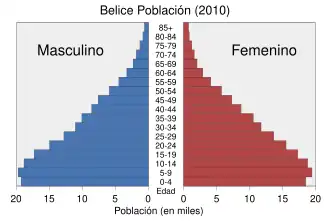 La población de Belice según el censo de 2010 era de 322 453 habitantes, con una densidad poblacional de 14 hab/km².[1] Belice es el país menos poblado y con la menor densidad poblacional de América Central.[2]