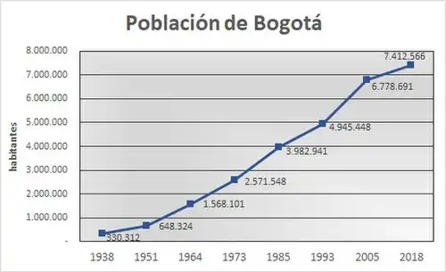 Bogotá es la capital de Colombia y es actualmente la ciudad más poblada del país.[2] con 7 412 566 habitantes para 2018 según el Departamento Administrativo Nacional de Estadística (DANE) .[3]
