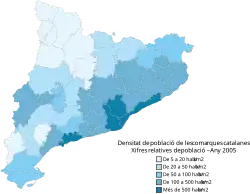 El resto del territorio catalán muestra una densidad demográfica muy baja y uniforme: 32 hab/km². La provincia de Lérida apenas supera los 34 hab/km². De la misma forma, los territorios interiores de las otras tres provincias muestran unos niveles similares. Solo la ciudad de Lérida y su área de influencia (~175 000 habitantes) rompe ese perfil demográfico.