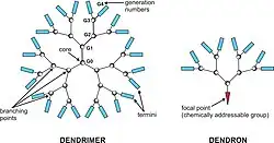 Un dendrímero es una macromolécula tridimensional de construcción arborescente. Los dendrímeros forman parte de los polímeros, pero su diferencia radica en que la distribución de las moléculas que constituyen a los polímeros lineales es probabilística, en tanto que en el caso de los dendrímeros, se tiene una estructura química precisa, donde los enlaces químicos entre los átomos pueden ser descritos con exactitud. Las macromoléculas dendriméricas presentan una forma de crecimiento generacional, G0, G1, G2.
