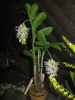 Es una orquídea de tamaño mediano a grande, que prefiere un clima cálido. Con hábitos epífitas con taallos, erectos o arqueados, largos como cañas, a menudo flexibles, tallos acanalados que llevan varias hojas, ovaladas, de color verde pálido, caducas, brillantes, coriáceas, ascendentes y curvadas. Florece en el invierno en una inflorescencia axilar, colgante, de 15 cm de largo, densamente cubiertas con 15 a 20 flores fragantes en racimo, Las flores son duraderas y surgen de los nodos en el vértice de las cañas sin hojas.