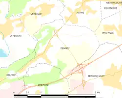 Denney es una comuna francesa situada en el departamento del Territorio de Belfort, de la región de Borgoña-Franco Condado. Forma parte de la aglomeración urbana de Belfort.