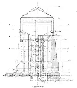 Es de fábrica de ladrillo rojo y cúpula gris, de planta poliédrica de doce lados. El interior del depósito es cilíndrico y posee un volumen de 1500 m³ elevado a una altura de treinta y seis metros.
