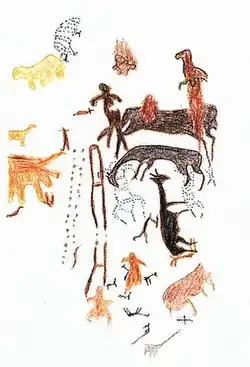 Petroglifos: Existen dispersos en la región Tacna una gran cantidad de petroglifos en los diversos valles o quebradas. La zona de mayor concentración de petroglifos de la región es la pampa de San Francisco en la zona de Miculla (distrito de Pachía).[35] Los petroglifos son piedras talladas con dibujos, que representan una mirada hacia las costumbres y modo de vida de la zona en la antigüedad. Pueden verse escenas de cacería, pastoreo, ceremonias rituales, danzantes y músicos con tocados, así como la fauna representativa de la zona plazmada en las piedras. Estas piedras fueron talladas desde tiempos de la incursión de la cultura Tiahuanaco en la zona, hacia el 500 d. C.[36]