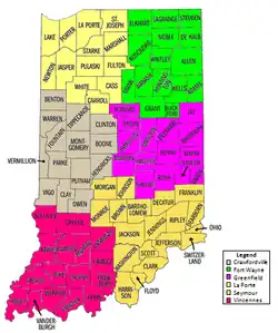 | Greenfield | Albany, Cambridge, Greenfield, Indianapolis, Tipton | Delaware, Fayette, Hamilton, Hancock, Henry, Howard, Jay, Madison, Marion, Randolph, Rush, Shelby, Tipton, Union and Wayne[5] |
