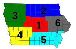 | Distrito 6 | Cedar Rapids | Benton, Buchanan, Cedar, Clinton, Delaware, Dubuque (Iowa), Jackson, Johnson, Jones, Linn, and Scott[11] |