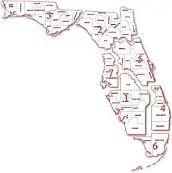 | Noroeste de la Florida (Distrito 3) | Chipley[5] | Bay, Calhoun, Escambia, Franklin, Gadsden, Gulf, Holmes, Jackson, Jefferson, Leon, Liberty, Okaloosa, Santa Rosa, Wakulla, Walton, y Washington |