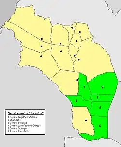 Los departamentos llanistos son seis: Chamical, General Belgrano, General Ángel Vicente Peñaloza, General Ocampo, General Juan Facundo Quiroga y General San Martín. Oficialmente, el gobierno provincial considera que los tres primeros forman parte de la Región 5 o Llanos del Norte (junto al departamento Independencia) mientras que los tres últimos integran, junto al departamento Rosario Vera Peñaloza, la Región 6 o Llanos del Sur.[2]