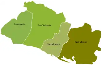 El departamento de Sonsonate abarcaba toda la zona occidental a excepción de la mitad norte del actual departamento de Santa Ana (lo que era en ese entonces el distrito de Metapán); el departamento de San Vicente abarcaba los actuales departamentos de San Vicente, La Paz y la mitad del de Cabañas, quedando el resto de la zona central (además del distrito de Metapán) en el departamento de San Salvador; y el departamento de San Miguel abarcaba toda la zona oriental.[2][3]