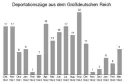 La deportación sistemática de judíos de Alemania hacia el Este comenzó a mediados de octubre de 1941, antes del 20 de enero de 1942, día de la Conferencia de Wannsee. Las fuentes indican que Adolf Hitler tomó esta decisión alrededor del día 17 de septiembre de 1941.[1] La mayoría de los judíos deportados del Reich alemán no fueron asesinados inmediatamente en su destino. Aunque los transportes individuales terminaron en los campos de exterminio de Sobibor o Maly Trostinez en 1942, la mayoría de los deportados fueron inicialmente mantenidos cautivos en condiciones de vida inhumanas en guetos o campos de trabajo. Muchos murieron allí, otros fueron posteriormente transportados a campos de exterminio y asesinados allí. Desde finales de 1942, los trenes también circulaban directamente a Auschwitz-Birkenau.