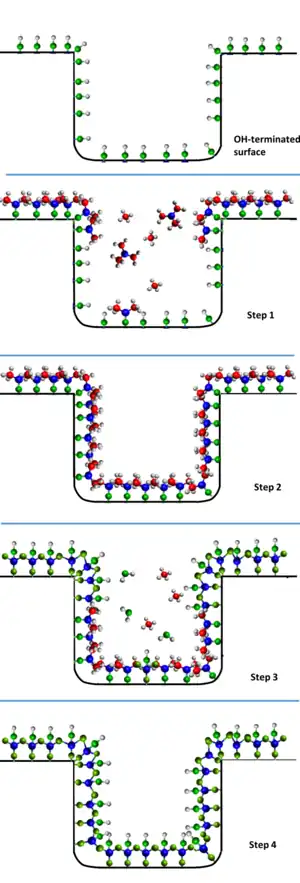 - ↑ a b c d e Oviroh, Peter Ozaveshe; Akbarzadeh, Rokhsareh; Pan, Dongqing; Coetzee, Rigardt Alfred Maarten; Jen, Tien-Chien (2019). «New Development of Atomic Layer Deposition: Processes, Methods, and Applications». Science and Technology of Advanced Materials 20 (1): 465-496. Bibcode:2019STAdM..20..465O. PMC 6534251. PMID 31164953. doi:10.1080/14686996.2019.1599694.