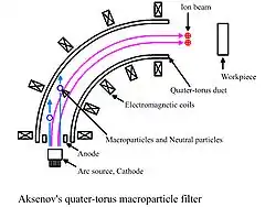 El haz de plasma procedente de una fuente de arco catódico contiene algunos cúmulos más grandes de átomos o moléculas (las llamadas macropartículas), que impiden que sea útil para algunas aplicaciones sin algún tipo de filtrado. Existen muchos diseños de filtros de macropartículas y el diseño más estudiado se basa en el trabajo de I.I. Aksenov y colaboradores en la década de 1970. Consiste en un conducto de un cuarto de toro doblado a 90 grados de la fuente de arco y el plasma es guiado fuera del conducto por el principio de la óptica de plasma.