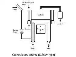 La fuente de arco catódico de tipo Sablev, que es la más utilizada en Occidente, consta de un blanco conductor eléctrico de forma cilíndrica corta en el cátodo con un extremo abierto. Este blanco tiene rodeado un anillo metálico eléctricamente flotante que funciona como anillo de confinamiento del arco. El ánodo del sistema puede ser la pared de la cámara de vacío o un ánodo discreto. Los puntos de arco se generan mediante un disparador mecánico (o encendedor) que golpea el extremo abierto del cátodo, provocando un cortocircuito temporal entre el cátodo y el ánodo. Una vez generados los puntos de arco, pueden ser dirigidos por un campo magnético o moverse aleatoriamente en ausencia de campo magnético.