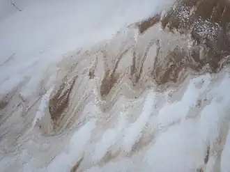 Inicialmente, después de que el viento lo ha depositado, la superficie de un depósito nivoeólico generalmente consiste en una mezcla de arena y nieve formando un lecho ondulado.[5] Debajo de la superficie, los depósitos suelen consistir en capas alternadas de nieve y sedimentos.[6] Estas capas pueden tener hasta 60 centímetros de espesor.[5] Sin embargo, a veces los sedimentos y la nieve se entremezclan sin capas distintas.[5]