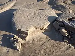 Durante la denivación, la nieve exterior se derrite primero, de modo que la superficie exterior del depósito nivoeólico restante está formada por arena. Esta arena superficial presenta grietas superficiales tensionales debido al continuo derretimiento de la nieve subyacente.[5]