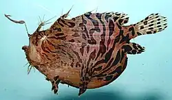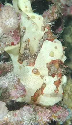 Muchos depredadores emboscados utilizan el camuflaje para que sus presas puedan acercarse sin detectar su presencia. Entre los insectos, la coloración de las chinches emboscadas se asemeja mucho a la de las cabezas de las flores donde esperan a sus presas.[9] Entre los peces, el Gillellus uranidea se entierra casi por completo en la arena y espera a sus presas.[10] El pez escorpión diablo suele permanecer parcialmente enterrado en el fondo marino o en una cabeza de coral durante el día, cubriéndose de arena y otros restos para camuflarse aún más.[11][12][13][14] El tiburón wobbegong con borlas es un tiburón cuyas adaptaciones como depredador emboscado incluyen un cuerpo fuertemente aplanado y camuflado con una franja que rompe su contorno.[15] Entre los anfibios, la coloración marrón de la Pipa pipa se mezcla con las aguas turbias de la selva amazónica, lo que permite a esta especie acechar y emboscar a su presa.[16]