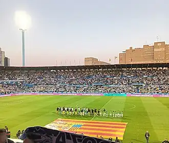![]() Partido entre el Real Zaragoza y la Sociedad Deportiva Huesca el 27 de abril de 2025 durante la temporada 24/25 de Segunda División en La Romareda. | ||||