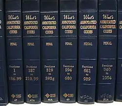 Los códigos de Nueva York se conocen como "Laws" (Leyes); en California y Texas se llaman "Codes" (Códigos) y la mayoría de los otros estados usan términos como "Revised Statutes" (Estatutos Revisados o Leyes Revisadas) o "Compiled Statutes" (Estatutos Compilados o Leyes Compiladas) para hacer referencia a sus códigos. California, Nueva York, y Texas tienen códigos distintos para diferentes temas, mientras que los otros estados y el gobierno federal usan un solo código dividido en títulos numerados.