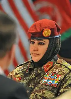 Las Fuerzas de seguridad nacional afganas, que incluye a la Policía nacional afgana, tienen un número creciente de mujeres oficiales. Uno de los General de Brigada del Ejército Nacional Afgano es Khatool Mohammadzai. En 2012, Niloofar Rahmani se convirtió en la primera mujer piloto en el programa de entrenamiento de pilotos Fuerza Aérea Afgana en volar solo en un avión de ala fija,[69] siguiendo los pasos del Coronel Latifa Nabizada, la primera mujer piloto afgana en volar un helicóptero militar. Otras mujeres afganas notables incluyen Roya Mahboob, Aziza Siddiqui, Mary Akrami, Suraya Pakzad, Wazhma Frogh, Shukria Asil, Shafiqa Quraishi, Maria Bashir, Maryam Durani, Malalai Bahaduri y Nasrin Oryakhil.