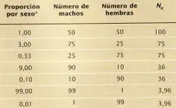 Por ejemplo, cuando una población consiste en 90 machos y 10 hembras, el tamaño efectivo de la población es de solo 36 y la deriva genética sucederá como si la población real consistiera de solo 36 individuos. De igual forma si fuesen 10 machos y 90 hembras. Otros factores que influyen en el tamaño efectivo de la población incluyen la variación entre los individuos en el éxito reproductivo, las variaciones en el tamaño de la población y si el apareamiento es aleatorio. También hay que decir que el tamaño efectivo de la población disminuye cuando hay cantidades desiguales de machos y hembras con capacidad reproductora.