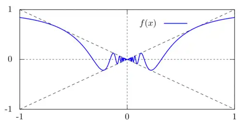 Para esta función se puede ver que es diferenciable en todos los puntos excepto para . Pero de nuevo las derivadas Dini existen y son finitas: