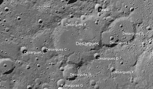 Por convención estos elementos son identificados en los mapas lunares poniendo la letra en el lado del punto medio del cráter que está más cerca de Desargues.