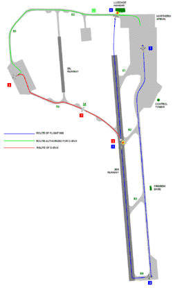 La Cessna Citation fue autorizada a rodar desde la platafórma oeste por la calle de rodadura norte (calle R5), y a continuación desde la plataforma norte a la calle de rodadura principal que discurre paralela a la pista principal, una ruta que mantendría al avión alejado de pista. En lugar de esto, el piloto circuló por la calle de rodadura sur (calle de rodadura R6), cruzó la pista y rodó por la calle de rodadura principal hasta dejarla tras de si (véase diagrama).