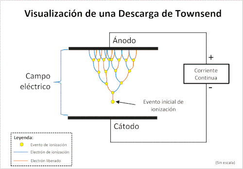 El montaje básico de los primeros experimentos de Townsend cuando investigaba las descargas ionizantes en gases, constaba de dos placas paralelas planas situadas a los lados de un recipiente llenado con un gas. Una fuente eléctrica de alta tensión se conectaba entre las placas (el cátodo al polo negativo, y el ánodo al positivo) forzando al cátodo a emitir electrones según el efecto fotoeléctrico irradiándolo con rayos X, encontrando que el flujo de corriente a través del gas dependía del campo eléctrico entre las placas. Aun así, esta corriente mostró un aumento exponencial cuando disminuía la distancia entre las placas, llegando a la conclusión de que los iones de gas se multiplicaban cuando se desplazaban entre las placas debido al elevado campo eléctrico.
