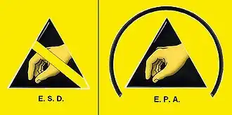 Símbolo para componentes electrónicos con riesgo de daño por ESD (izquierda) y equipos protegidos contra electrificación (derecha).