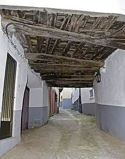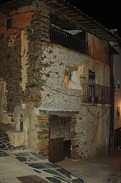 Situado al fin de una barrera, entre dos sierras llamadas la Bolla y Gomares, y a la margen del río Arrago, goza de clima benigno, templado, aunque ligeramente húmedo y de poco horizonte; reinan los vientos del N. y O., y se padecen catarros en invierno, inflamatorias en primavera, é intermitentes y disenterías en verano y otoño: tiene 120 casas de 2 y 3 pisos la mayor parte, construidas de adobes con corredores de madera y de 7 a 8 varas de altura, que forman nueve calles pendientes y empedradas de 4 a 5 varas de anchas, y una plaza casi triangular pequeña sin portales; el pueblo tiene dos entradas principales, una al N. llamada Carrera y otra al S., barrio de la Iglesia con varios sotos y heredades en los otros lados... hay una casa-conc. muy mal preparada, con una habitación pequeña para las sesiones de ayunt., con cárcel amenazando ruina é insegura, escuela de primera educación, dotada con 1.100 rs. pagados por retribución de los 30 niños y 10 niñas que concurren... 2 ermitas, una a la entrada N. de la v. con el título del Cordero, y otra unos mil pasos al S. con el Cristo del Humilladero, hallándose el cementerio entre esta y la iglesia, que no daña la salud. Se surte el pueblo de aguas potables en una fuente que hay dentro de sus calles al O. y otras infinitas en las inmediaciones, todas de ricas aguas, como país de sierra... comprende 350 fan. de terreno cultivable, un monte bajo de brezo y carquesa, algunos pinares bravíos en todas direcciones, un corto número de encinas y alcornoques, y varios corrales para el ganado cabrío... el terreno es muy quebrado y ligero, necesitando de mucho beneficio para sus escasos prod., cruzado todo de sierras... le bañan el r. Arrago en dirección de N. a S. quedando el pueblo a su der., y el arroyo llamado Mediafanega que se une al anterior á la entrada de la v. y tiene un puente de madera un poco antes de unirse camino de Robledillo. CAMINOS: al N. conduce á Robledillo, aunque descuidado suben hasta allí carros cargados; el que conduce á Castilla al NO. llamado Puerto de Descarga-María no admite más que caballerías; el del S. que comunica con toda la sierra é interior de Estremadura, es carretero y esta bien cuidado... PROD.: aceite, vino, castañas y hortalizas; se mantiene ganado cabrío, unas 80 caballerías mulares, que sirven para la recolección de frutos y alguna arriería, y se cría caza de todas clases. IND. Y COMERCIO: 2 tejedores, 4 molinos de harina, 5 de aceite en decadencia por su excesivo número con relación a los frutos: extracción de aceite y vinos para Castilla, é importación de cereales, arroz y otros art. POBL.: 150 vec., 822 alm. CAP.PROD: 1.411 rs. IMP.: 112.880. CONTR.: 9.530. PRESUPUESTO MUNICIPAL: 2.800, del que se pagan 300 al secretario por su dotación, y se cubre con el prod. de propios y arbitrios, que consisten en terrenos adehesados y escasa bellota de monte.