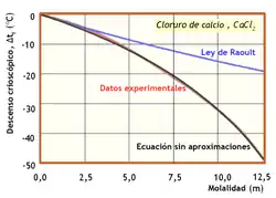 En disolución, por tanto, hay más partículas que las disueltas inicialmente porque parte de estas se han disociado en iones.[3] En la figura se observa que los datos experimentales se desvían mucho de la predicción de la Ley de Raoult.