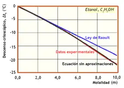 La fórmula de Raoult del descenso crioscópico solo da valores iguales a los experimentales cuando las disoluciones son muy diluidas. Para aplicarla a disoluciones reales, donde la concentración es mayor, hay que usar una ecuación que se obtiene en la demostración termodinámica antes de simplificarla y sustituyendo en ella la fracción molar del disolvente por la actividad de este, o bien el producto del coeficiente de actividad por la fracción molar.