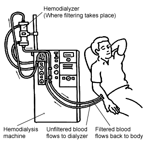 - Ocasionalmente durante la diálisis, los pacientes pueden tener baja tensión arterial y pueden perder la conciencia. Frecuentemente esto es temporal y pasa después de que la cabeza se pone en un nivel más bajo que el resto del cuerpo, (posición de Trendelenburg), por un tiempo corto. Esto se hace mediante los controles en la silla-sofá en donde descansa el paciente durante la hemodiálisis.