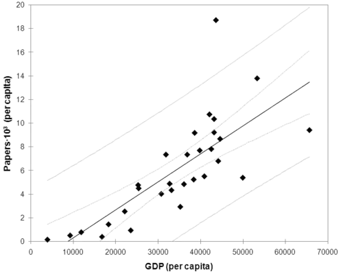 Si se elimina el efecto de la población dividiendo el número de publicaciones entre la población total del país, para descontar los efectos de escala, se obtiene que ni China, ni Estados Unidos son los países con mayor producción per cápita, sino países como Suiza e Irlanda. Analizando los datos de producción científica per cápita se observa que esta está altamente correlacionada con el PIB per cápita, así países como India, Brasil o China tienen producciones científicas per cápita bastante inteferiores a Europa, Estados Unidos o Japón.
