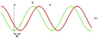 En el diagrama de derecha, el desfase vale , donde T es el período de la onda y el retardo de la curva verde con respecto a la roja (en segundos).
