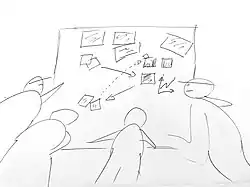 Después de recoger y organizar las ideas, un equipo pasa por un proceso de búsqueda y síntesis de patrones en el que tiene que transformar las ideas en ideas que puedan llevar a soluciones u oportunidades para generar un cambio. Estas pueden ser visiones de nuevas ofertas de productos o alternativas entre varias formas de crear nuevas experiencias.[25]