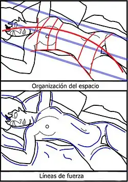 Y es esta línea (fundamento del arte de Modigliani) en este desnudo en particular, la que marca los límites entre el caos y la creación. La línea establece los contornos entre las luces y las sombras, marca espacios y construye volúmenes. Es la línea y sus diferentes espesores lo que delimita el primer plano y el fondo. Es en el uso de la línea donde Modigliani logra una conquista, un costoso armisticio entre el clasicismo y la modernidad, entre el amor sacro y el profano, entre la carne y el ideal. Una línea trabajada desde su juventud y que es la marca característica del artista.
