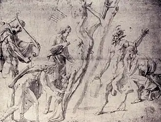 La elección de una escena tan violenta fue quizás inspirada en la muerte de Marco Antonio Bragadin, el comandante veneciano de Famagusta en Chipre que fue desollado vivo por los otomanos cuando la ciudad cayó en agosto de 1571, causando una enorme indignación en Venecia.[6] La composición deriva indudablemente de la de Giulio Romano varias décadas antes.[3]