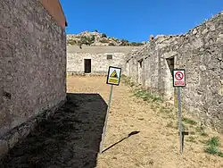 Respecto a la estructura represiva del penal, esta incluyó: la vivienda del teniente de la policía armada, tres barracones para los presos, un patio central, un economato, una enfermería, una cocina, letrinas y habitaciones para los guardias «situadas en la parte delantera actuando como un filtro entre los presos y el exterior».[18] Como estructuras secundarias se pueden encontrar cuatro garitas, el polvorín, las cuadras y un lavadero de ropa. Alrededor se pueden observar varias torretas cuya función era controlar incursiones del exterior, como las de los «maquis», más que a los propios presos.[19] Esta peculiaridad se puede deducir por una arquitectura orientada al exterior. Algo llamativo es la falta de una verja pues tenían permitido estar fuera del destacamento en su horario de descanso, reflejando una idea de falsa libertad, la cual fue introducida durante el franquismo con el objetivo de llevar a cabo un moldeamiento ideológico y aprovechar la fuerza productiva de los presos. Esto es característico ya que difiere del modelo clásico carcelario de vigilancia denominado «panóptico benthamiano».[20]