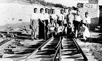 ![]() Construcción de un desvío en los años 1920 ya con trocha económica. El desvío de la imagen es ilustrativo y aparece detrás una construcción que quizás albergaba pasajeros. | |||||||||